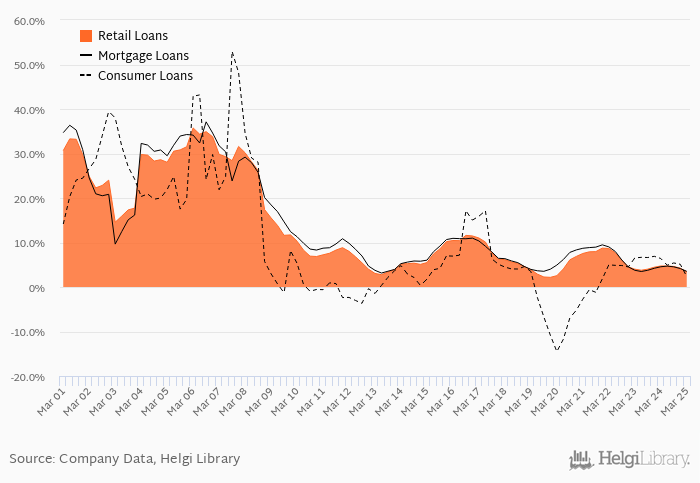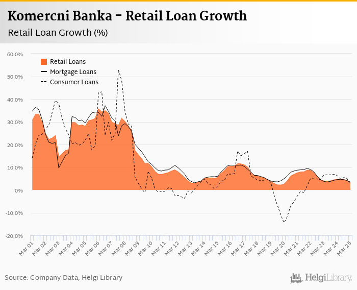 Komercni Banka's retail loans reached CZK 424,500 mil at the end of 2025-03-31, up 0.283% compared to the previous year. In the last decade, the average annual loan growth amounted to 6.20%.
