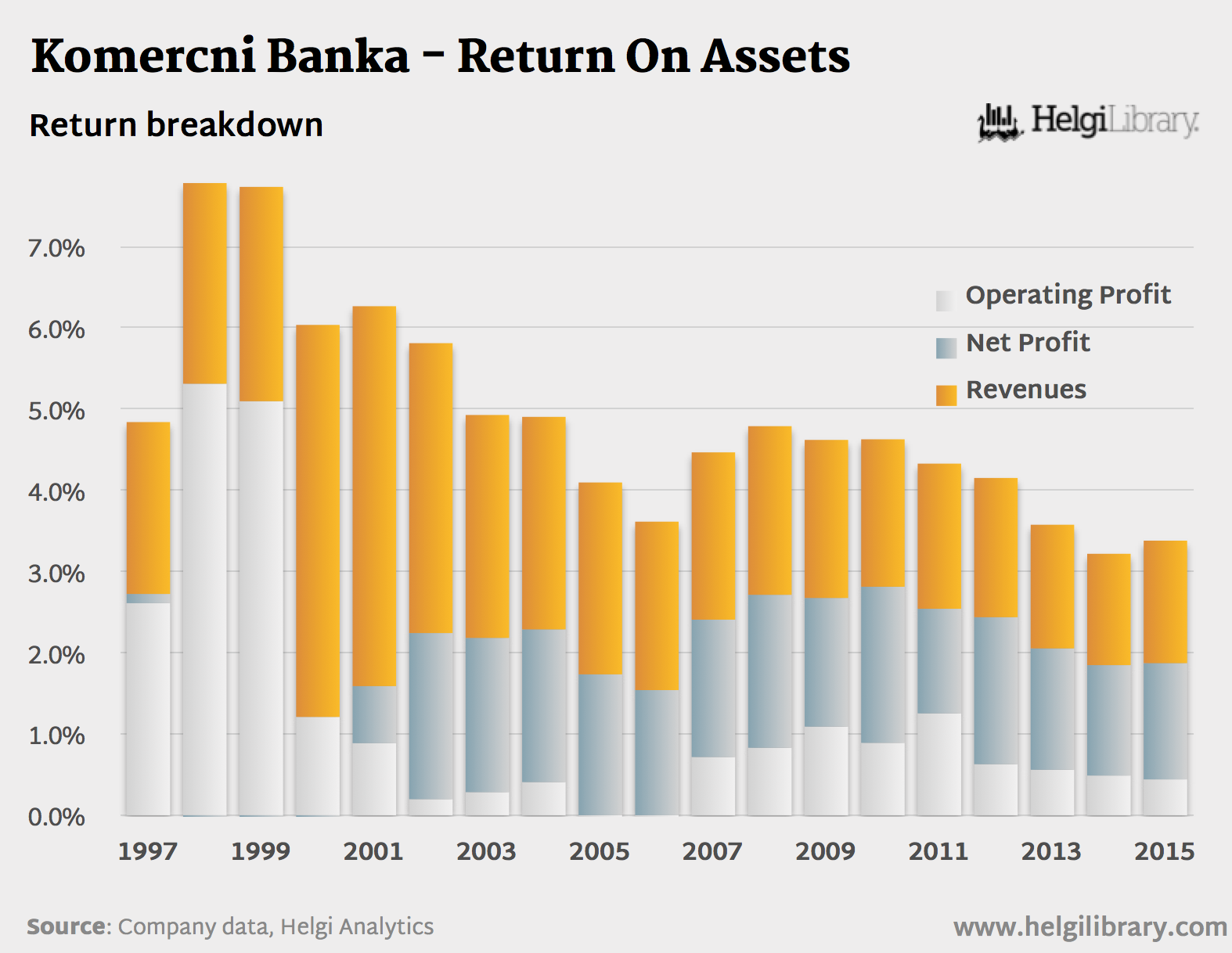 Following hefty loan losses and a government-orchestrated bailout at the end of the 1990s, 60% of the bank was sold to France's Societe Generale in 2001. Since the takeover, Komerční Banka's net profit has increased fivefold and the bank's ROE has been amounting to 10-20%.