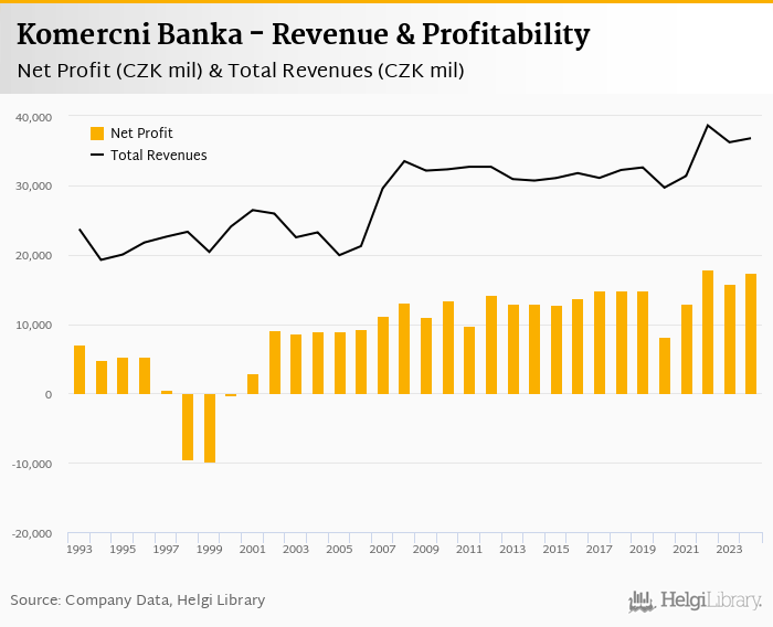 Komercni Banka made a net profit of CZK 17,408 mil under revenues of CZK 36,786 mil in 2024, up 10.0% and 1.62% respectively compared to the previous year.