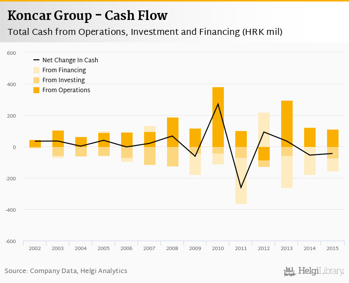 Cash from financing amounted to HRK -83.8 mil, so the company generated HRK -44.6 mil net cash in 2015.
