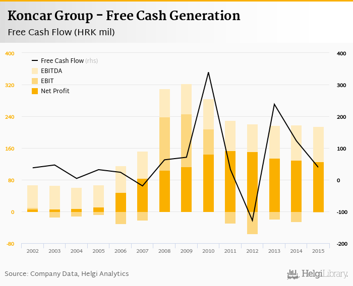 The company generated cash, defined by a sum of net profit and depreciation, of HRK 215 mil or 7.05% of sales. When investments are excluded, free cash flow reached HRK 39.2 mil, or 1.28% of sales in 2015.