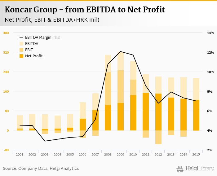 Historically, between 2001 - 2015, the firm’s net profit reached a high of HRK 154 mil in 2011 and a low of HRK 4.17 mil in 2001. Since 2010, the firm's net profit has decreased 13% or -2.75% a year on average.