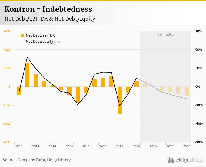 Kontron's net debt stood at EUR 92.7 mil and accounted for 13.5% of equity at the end of 2024. The ratio is up 26.2 pp compared to the previous year.