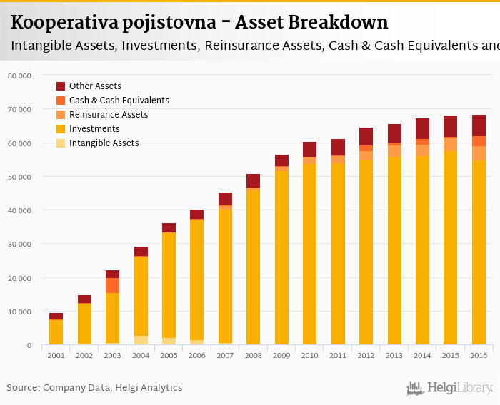 Investments amounted to CZK 54,692 mil, or 78.1% of total assets while reinsurance assets reached CZK 4,220 mil at the end of 2016.