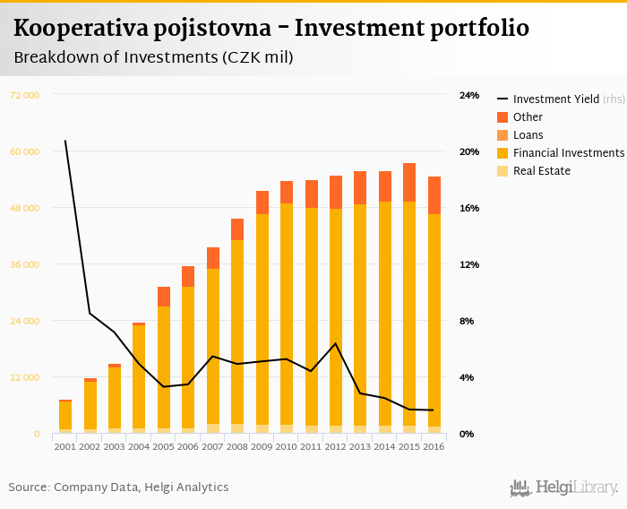 Kooperativa pojistovna's total investments reached CZK 54,692 mil at the end of 2016, down 4.81% when compared to the previous year.