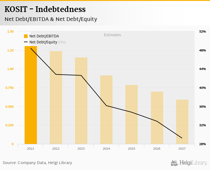 KOSIT's net debt stood at EUR 16.9 mil and accounted for 48.4% of equity at the end of 2021. The ratio is up 48.4 pp compared to the previous year.