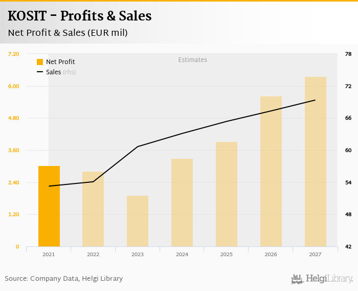 KOSIT made a net profit of EUR 3.03 mil in 2021, up 0% compared to the previous year. Total sales reached EUR 53.3 mil, which is up 0% when compared to the previous year.