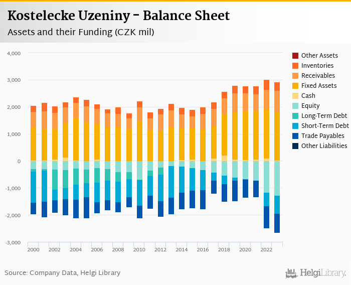 Kostelecke Uzeniny's total assets reached CZK 2,944 mil at the end of 2023, down 2.78% compared to the previous year.