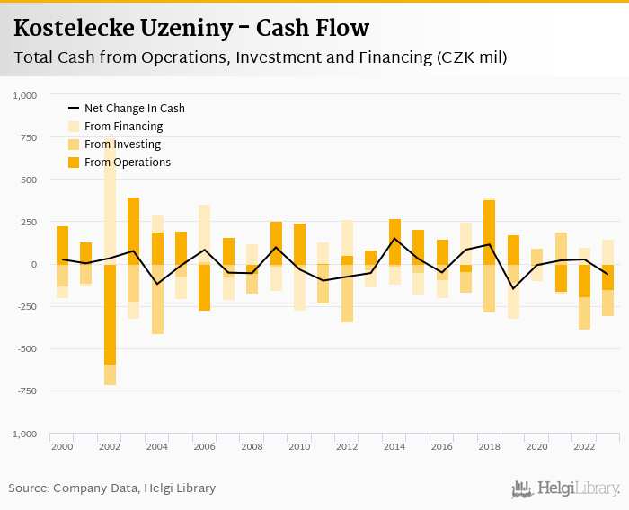 Cash from financing amounted to CZK 149 mil, so the company generated CZK -65.0 mil net cash in 2023.