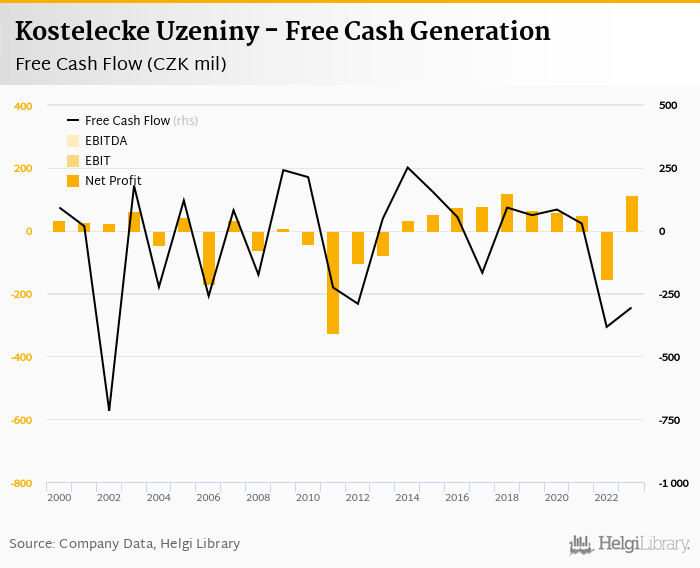The company generated cash, defined by a sum of net profit and depreciation, of CZK 294 mil or 4.48% of sales. When investments are excluded, free cash flow reached CZK -306 mil, or -4.65% of sales in 2023.