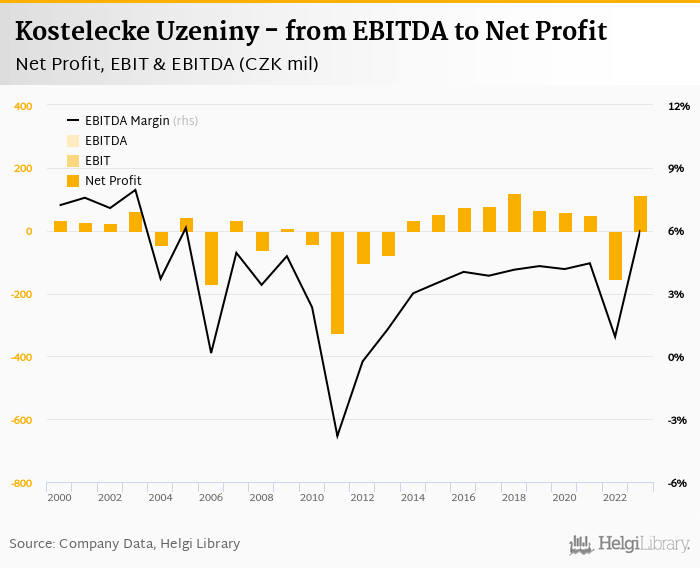 Kostelecke Uzeniny made a net profit of CZK 115 mil with revenues of CZK 6,570 mil in 2023, up by 175% and up by 4.34%, respectively, compared to the previous year. This translates into a net margin of 1.75%.