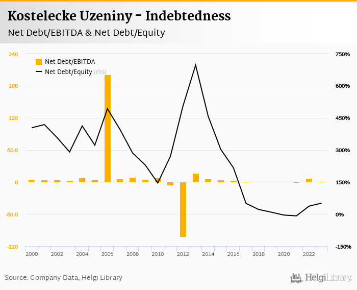 Kostelecke Uzeniny's net debt stood at CZK 643 mil and accounted for 50.7% of equity at the end of 2023. The ratio is up 13.9 pp compared to the previous year.