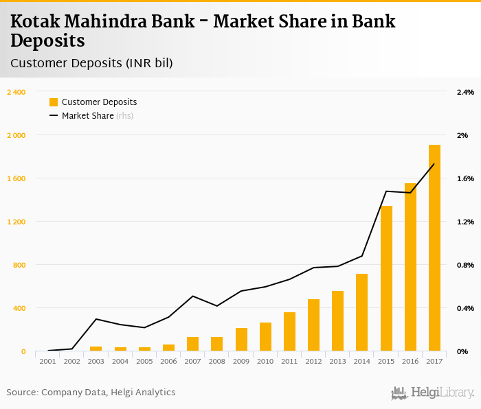 Kotak Mahindra Bank accounted for 1.73% of all customer deposits taken by banks in India at the end of 2017. Historically, the bank’s market share in customer deposits reached an all time high of 1.73% in 2017 and an all time low of 0% in 2001.