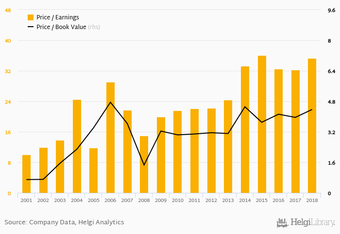 In terms of price to book value, the stock reached 4.37x at the end of 2018. Since 2013, the multiple reached an all time high of 4.51x in 2014 and an all time low of 3.70x in 2015 with an average of 4.13x.