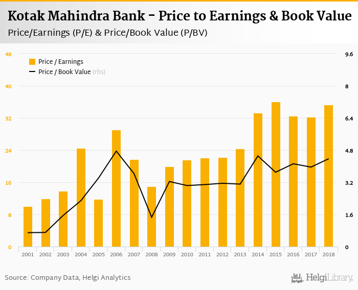 Kotak Mahindra Bank stock traded at INR 1,334 per share at the end 2018 implying a market capitalization of USD 36,497 mil.