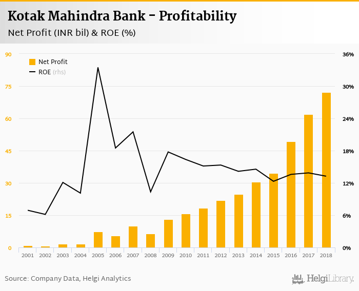 Kotak Mahindra Bank made a net profit of INR 72.0 bil in 2018, up 16.2% compared to the previous year. This implies a return on equity of 13.2%.