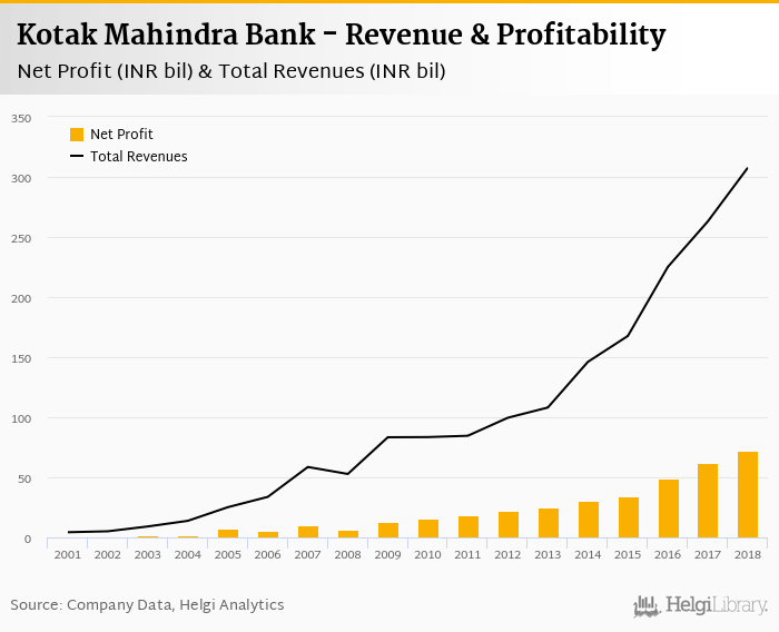 Kotak Mahindra Bank made a net profit of INR 72.0 bil under revenues of INR 308 bil in 2018, up 16.2% and 17.0% respectively compared to the previous year.