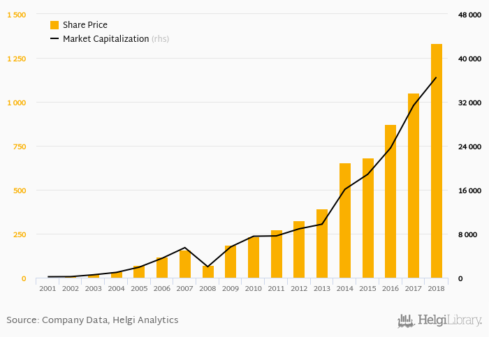 Since the end of 2013, the stock has appreciated by 240 % implying an annual average growth of 27.7 %. In absolute terms, the value of the company rose by USD 26,762 mil.