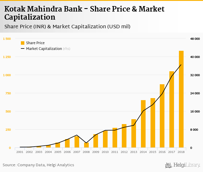 Kotak Mahindra Bank stock traded at INR 1,334 per share at the end of 2018 implying a market capitalization of USD 36,497 mil.