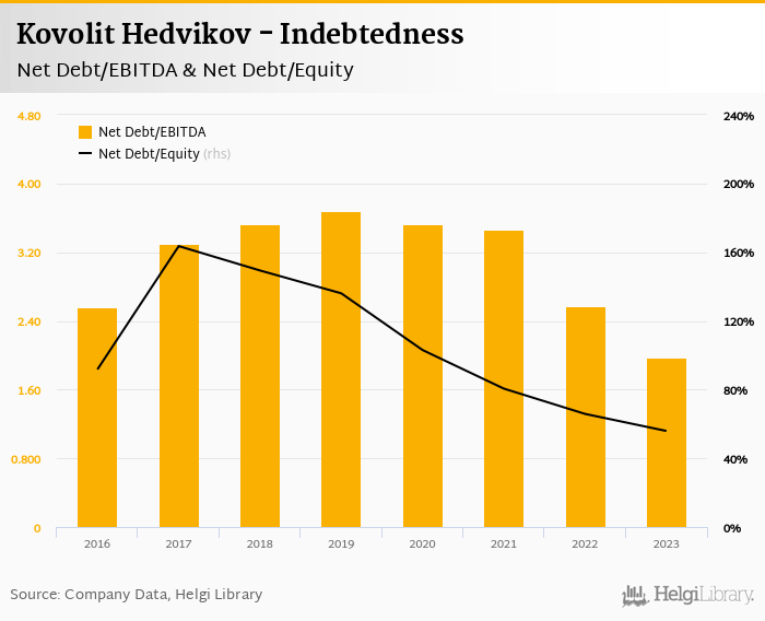 Kovolit Hedvikov's net debt stood at CZK 435 mil and accounted for 55.9% of equity at the end of 2023. The ratio is down 9.92 pp compared to the previous year.