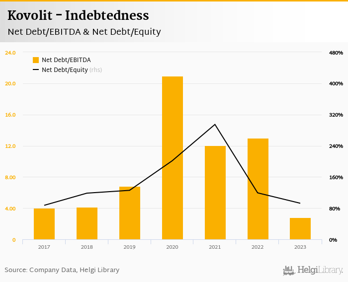 Kovolit's net debt stood at CZK 146 mil and accounted for 92.4% of equity at the end of 2023. The ratio is down 26.7 pp compared to the previous year.
