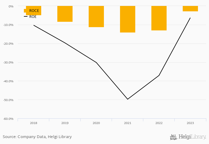 The result implies a return on equity of -6.27% and a return on invested capital of -2.77% in 2023. That is compared to an average of -28.6% and -9.84% over the last five years.