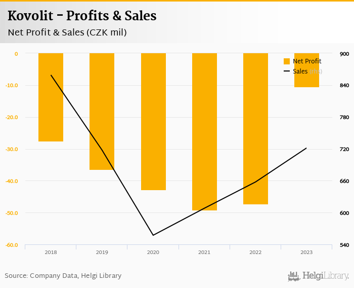 Kovolit made a net profit of CZK -10.4 mil in 2023, up 77.9% compared to the previous year. Total sales reached CZK 722 mil, which is up 9.75% when compared to the previous year.