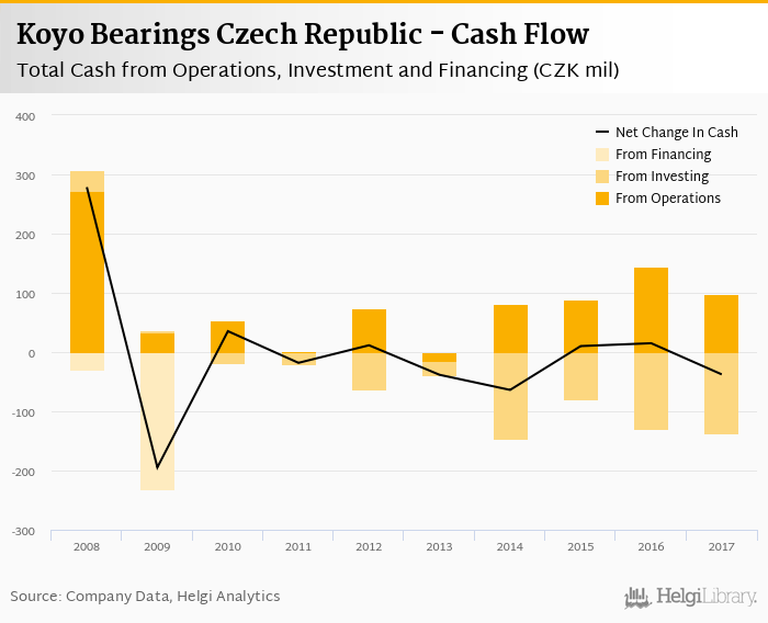 Koyo Bearings Czech Republic's operating cash flow stood at CZK 98.8 mil in 2017, down 31.3% when compared to the previous year. Historically, between 2008 - 2017, the firm’s operating cash flow reached a high of CZK 272 mil in 2008 and a low of CZK -15.0 mil in 2013.
