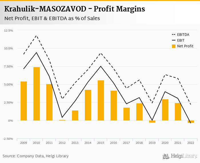 Krahulik-MASOZAVOD made a net profit of CZK -5.37 mil with revenues of CZK 1,650 mil in 2022, down by 115% and up by 13.6%, respectively, compared to the previous year.
