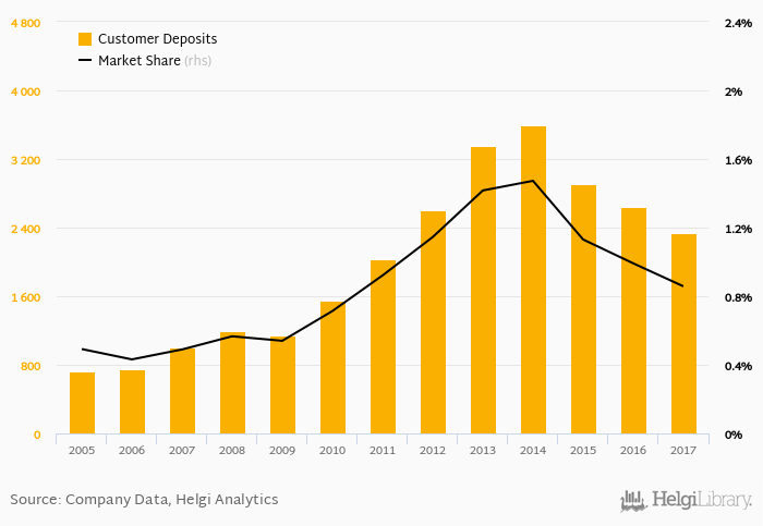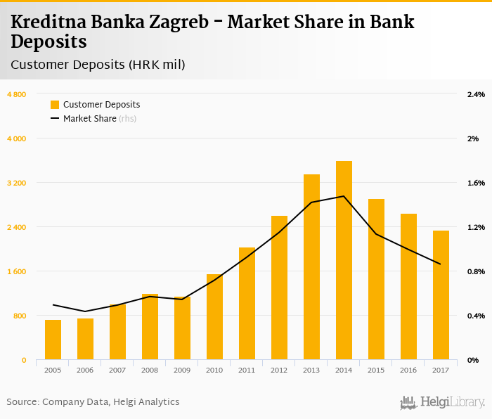Kreditna Banka Zagreb accounted for 0.858% of all customer deposits taken by banks in Croatia at the end of 2017. Historically, the bank’s market share in customer deposits reached an all time high of 1.47% in 2014 and an all time low of 0.432% in 2006.