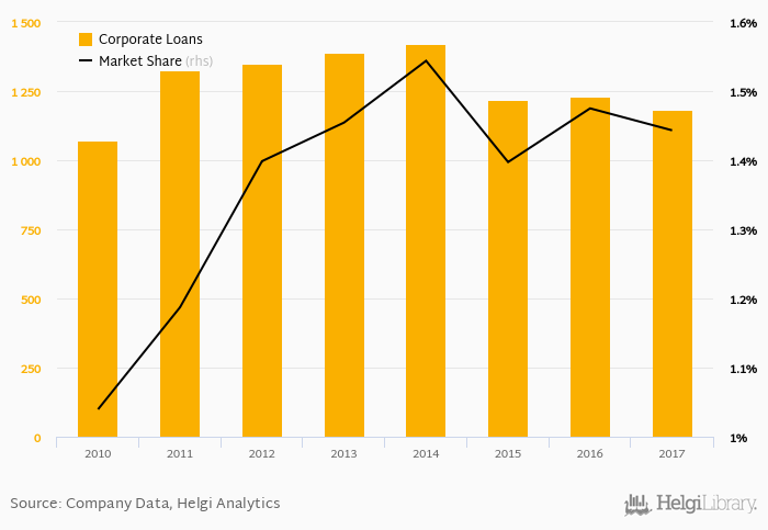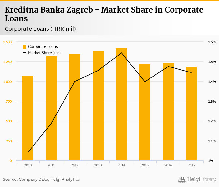Kreditna Banka Zagreb accounted for 1.44% of all corporate loans issued in Croatia at the end of 2017. Historically, the bank’s market share in corporate loans reached an all time high of 1.54% in 2014 and an all time low of 1.04% in 2010.