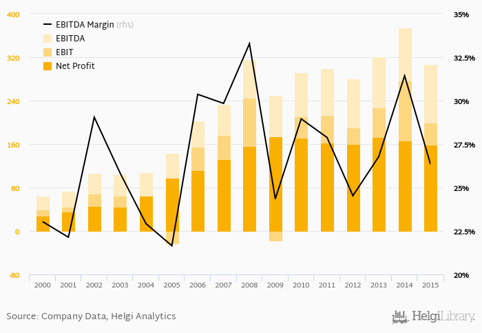 Historically, between 2000 - 2015, the firm’s net profit reached a high of EUR 174 mil in 2009 and a low of EUR 27.6 mil in 2000. Since 2010, the firm's net profit has decreased 7.47% or -1.54% a year on average.