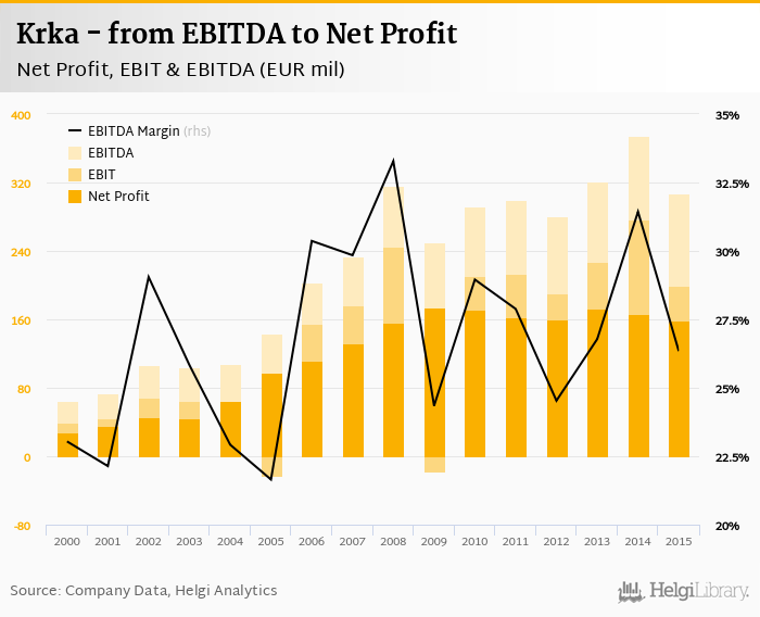 Krka made a net profit of EUR 158 mil with revenues of EUR 1,165 mil in 2015, down by 4.8% and down by 2.27%, respectively, compared to the previous year. This translates into a net margin of 13.6%.