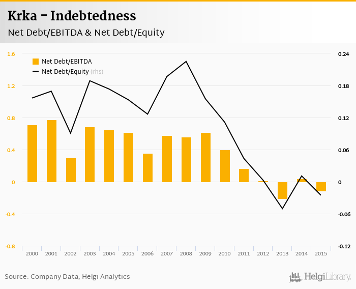 Krka's net debt stood at EUR -35.8 mil and accounted for -0.025 of equity at the end of 2015. The ratio is down 0.036 pp compared to the previous year.