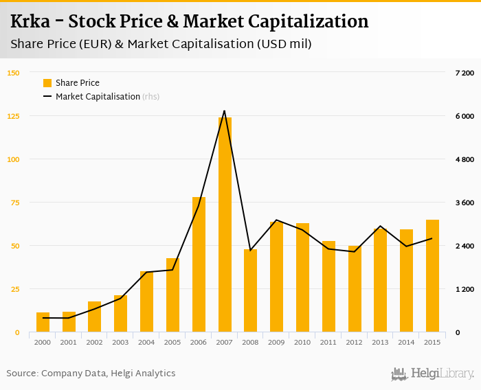 Krka stock traded at EUR 65.2 per share at the end 2015 implying a market capitalization of USD 2,588 mil.