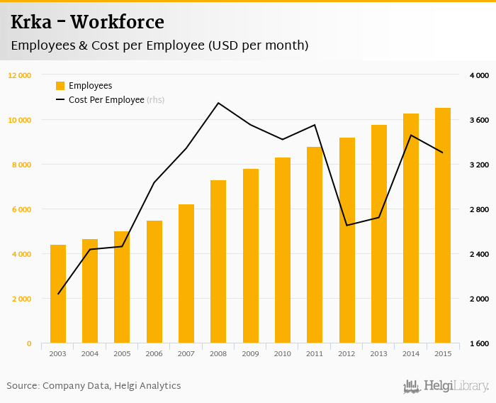 Krka employed 10,532 employees in 2015, up 2.41% compared to the previous year. Historically, between 2003 and 2015, the firm's workforce hit a high of 10,532 employees in 2015 and a low of 4,424 employees in 2003.
