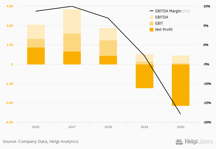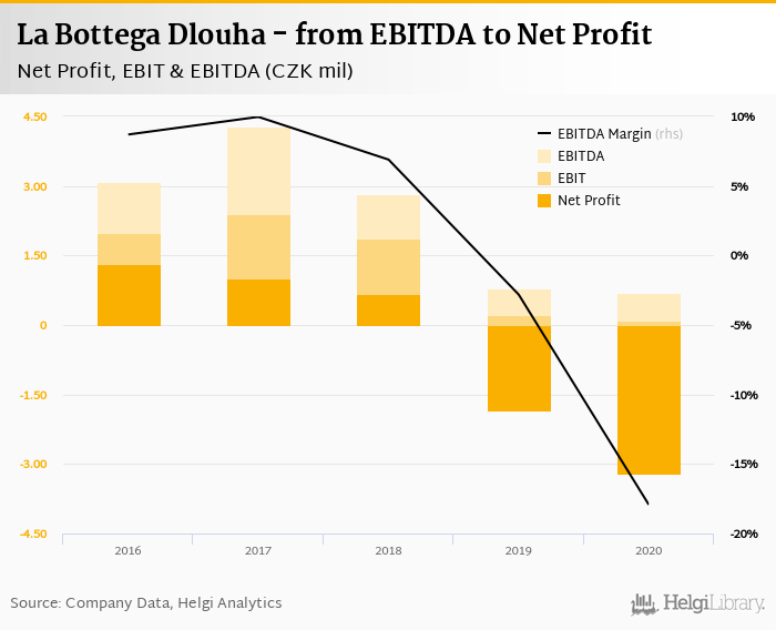 La Bottega Dlouha made a net profit of CZK -3.22 mil with revenues of CZK 14.1 mil in 2020, down by 73.4% and down by 62.6%, respectively, compared to the previous year. This translates into a net margin of -22.8%.
