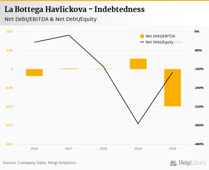 La Bottega Havlickova's net debt stood at CZK 6.93 mil and accounted for -173% of equity at the end of 2020. The ratio is up 220 pp compared to the previous year.