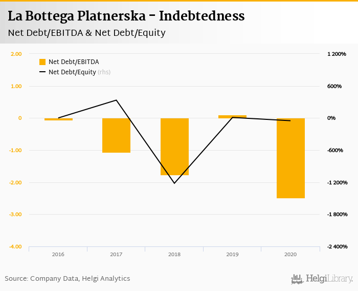 La Bottega Platnerska's net debt stood at CZK 1.26 mil and accounted for -50.7% of equity at the end of 2020. The ratio is down 61.0 pp compared to the previous year.
