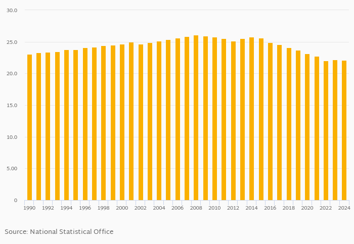 Labour Force, Female (As % of Total Labour Force) fell 0.389% to 22.1% in Morocco in 2024, according to .