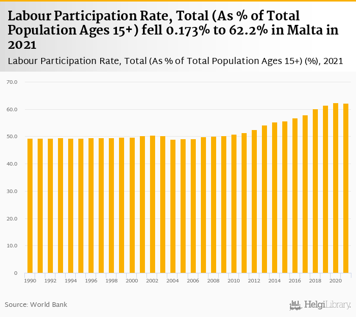 Labour Participation Rate, Total (As % of Total Population Ages 15+) fell 0.173% to 62.2% in Malta in 2021, according to World Bank.