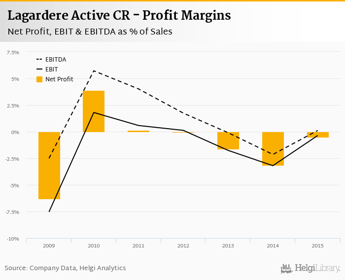 Lagardere Active CR made a net profit of CZK -0.735 mil with revenues of CZK 147 mil in 2015, up by 84.3% and down by 1.88%, respectively, compared to the previous year.