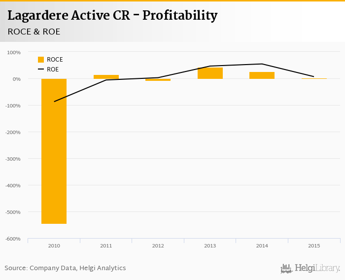 As far as Lagardere Active CR's peers are concerned, Mafra generated ROE of 8.19% and ROCE of 7.29% in 2015. Czech News Center's profitability reached 2.37% and 0.797%, respectively. Economia operated with -81.5% and -16.1% returns in 2015.