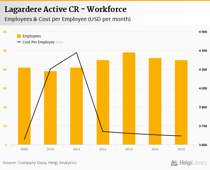 Lagardere Active CR employed 45.0 employees in 2015, down 2.17% compared to the previous year. Historically, between 2009 and 2015, the firm's workforce hit a high of 49.0 employees in 2013 and a low of 39.0 employees in 2010.