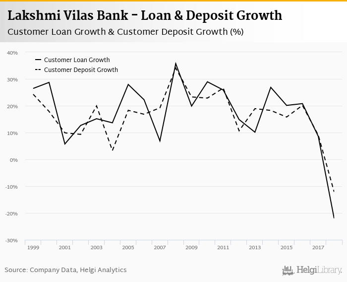 Lakshmi Vilas Bank's customer loan growth reached -22.0% in 2018, down from 8.59% compared to the previous year. Historically, the bank’s loans growth reached an all time high of 35.7% in 2008 and an all time low of -22.0% in 2018. In the last decade, the average annual loan growth amounted to 14.4%.