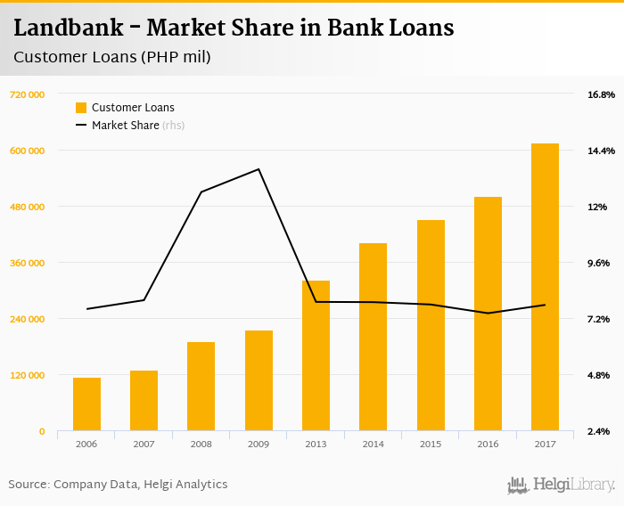 Landbank accounted for 7.76% of all customer loans issued in Philippines at the end of 2017. Historically, the bank’s market share in customer loans reached an all time high of 13.6% in 2009 and an all time low of 7.41% in 2016.