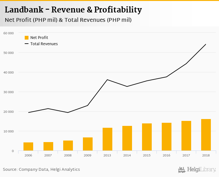 Landbank made a net profit of PHP 16,144 mil under revenues of PHP 54,225 mil in 2018, up 5.71% and 22.5% respectively compared to the previous year.