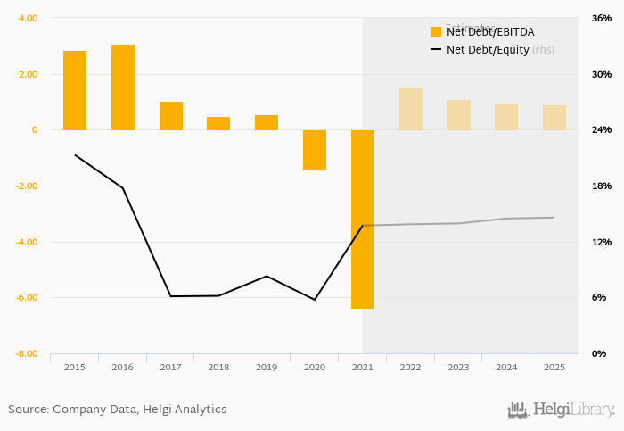 Historically, the firm’s net debt to equity reached a high of 21.3% in 2015 and a low of 5.74% in 2020 between 2015 and 2021. The average for the last five years was 8.01%.