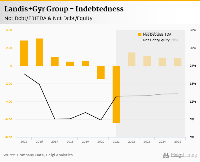 Landis+Gyr Group's net debt stood at USD 184 mil and accounted for 13.7% of equity at the end of 2021. The ratio is up 7.97 pp compared to the previous year.