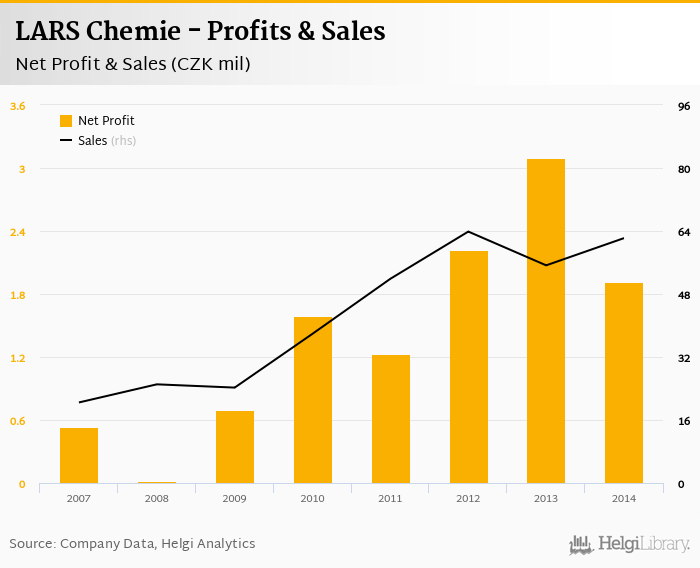 LARS Chemie made a net profit of CZK 1.92 mil in 2014, down 37.9% compared to the previous year. Total sales reached CZK 62.2 mil, which is up 12.5% when compared to the previous year.